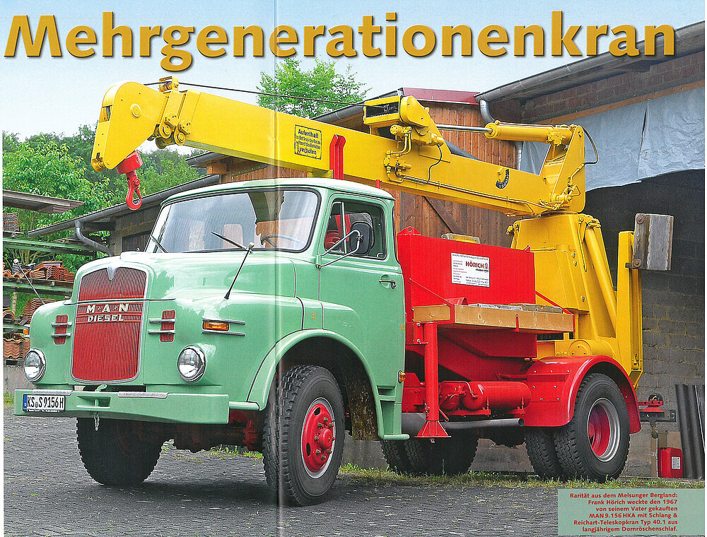 Während Frank erzählt, hat sein 12 Jahre alter Sohn Jonas den Raum betreten. Der erklärte Fan des MAN Kranwagens legt das dicke Firmenbuch auf den Tisch: Das Holzbau-Unternehmen besteht nämlich schon seit Generationen. Am 31. Oktober 1967 war folgender Eintrag vorgenommen worden: "Gebrüder Hörich, MAN 9.156 Wilhelm Schäfer" ist da in Handschrift zu lesen. "Schäfer Baumaschinen" in Heppenheim vertrieb damals die Autokran von Schlang & Reichart. für ein Modell des Marktoberdorfer Herstellers, genauer für den 4,9 Tonnen-Kran 40.1, hatte sich August Hörich seinerzeit entschieden. Direkt vom Münchener MAN-Werk aus war das Kipper-Fahrgestell 9.156 HKA damals zu Schlang & Reichart geliefert worden, wo der Hydraulik-Kran mit dem dreistufigen Teleskopausleger aufgebaut wurde. Die Erstzulassung in Söhrewald erfolgte kurz vor Weihnachten 1967.