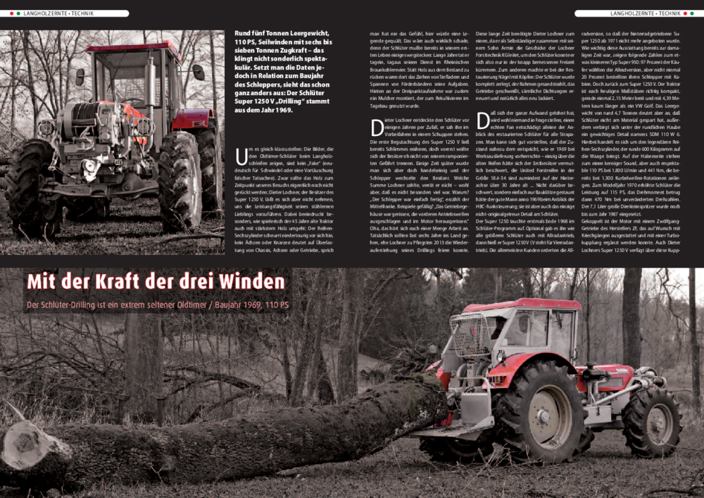 Um es gleich klarzustellen: Die Bilder, die den Oldtimer-Schlüter beim Langholzschleifen zeigen, sind kein „Fake“ (neudeutsch für Schwindel oder eine Vortäuschung falscher Tatsachen). Zwar sollte das Holz zum Zeitpunkt unseres Besuchs eigentlich noch nicht gerückt werden; Dieter Lochner, der Besitzer des Super 1250 V, läßt es sich aber nicht nehmen, uns die Leistungsfähigkeit seines stählernen Lieblings vorzuführen. Dabei beeindruckt besonders, wie spielerisch der 45 Jahre alte Traktor auch mit stärkstem Holz umgeht: Der Reihen- Sechszylinder schnurrt niedertourig vor sich hin, kein Ächzen oder Knarzen deutet auf Überlastung von Chassis, Achsen oder Getriebe, sprich man hat nie das Gefühl, hier würde eine Legende gequält. Das wäre auch wirklich schade, denn der Schlüter mußte bereits in seinem ersten Leben einiges wegstecken: Lange Jahre tat er tagein, tagaus seinen Dienst im Rheinischen Braunkohlerevier. Statt Holz aus dem Bestand zu rücken waren dort das Ziehen von Tiefladern und Spannen von Förderbändern seine Aufgaben. Hinten an der Dreipunktaufnahme war zudem ein Mulcher montiert, der zum Rekultivieren im Tagebau genutzt wurde.