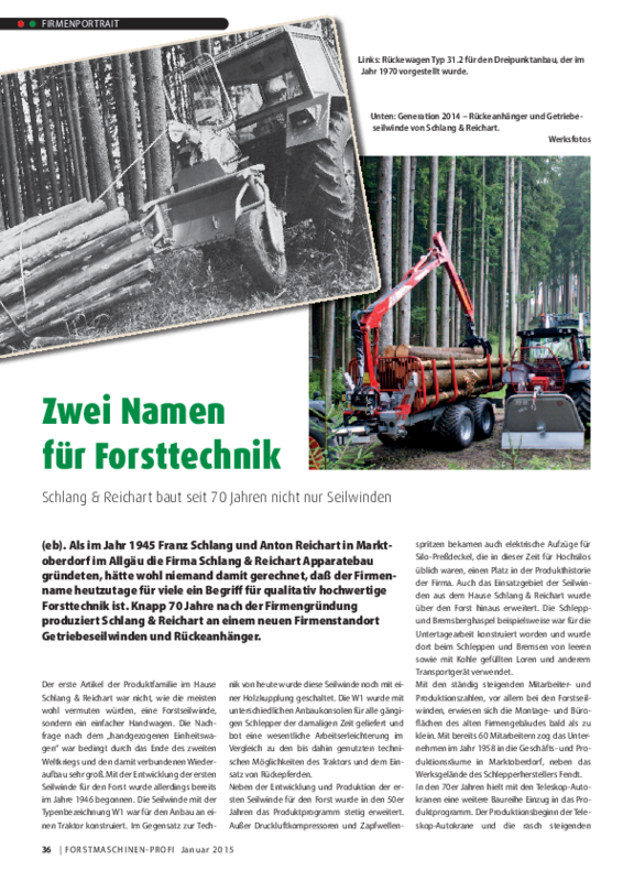 Als im Jahr 1945 Franz Schlang und Anton Reichart in Marktoberdorf im Allgäu die Firma Schlang & Reichart Apparatebau gründeten, hätte wohl niemand damit gerechnet, daß der Firmenname heutzutage für viele ein Begriff für qualitativ hochwertige Forsttechnik ist. Knapp 70 Jahre nach der Firmengründung produziert Schlang & Reichart an einem neuen Firmenstandort Getriebeseilwinden und Rückeanhänger.
