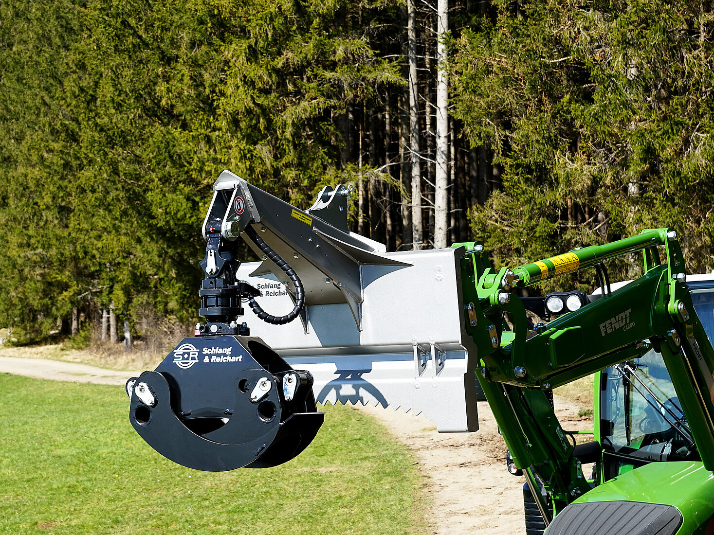 Le grappin à bois hydraulique RZ230 est équipé d‘un support de fixation pour chargeur frontal et attelage trois points. Cela permet une utilisation pour le débardage et le chargement des grumes. Le travail avec le grappin à bois se fait beaucoup plus rapidement, sans effort et sans descendre du tracteur. Les billons en longueur peuvent être soulevés et transportés à l'aide d’un peigne à bois denté incurvé entre les bras inférieurs. La fonction électrique permet de permuter entre le grappin et la rotation du rotator.