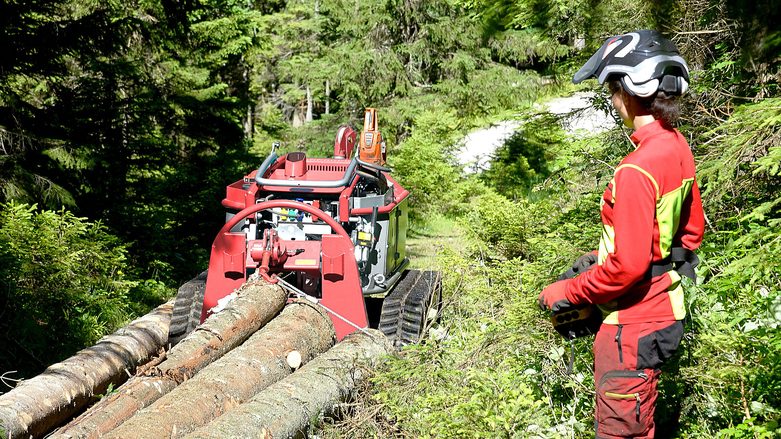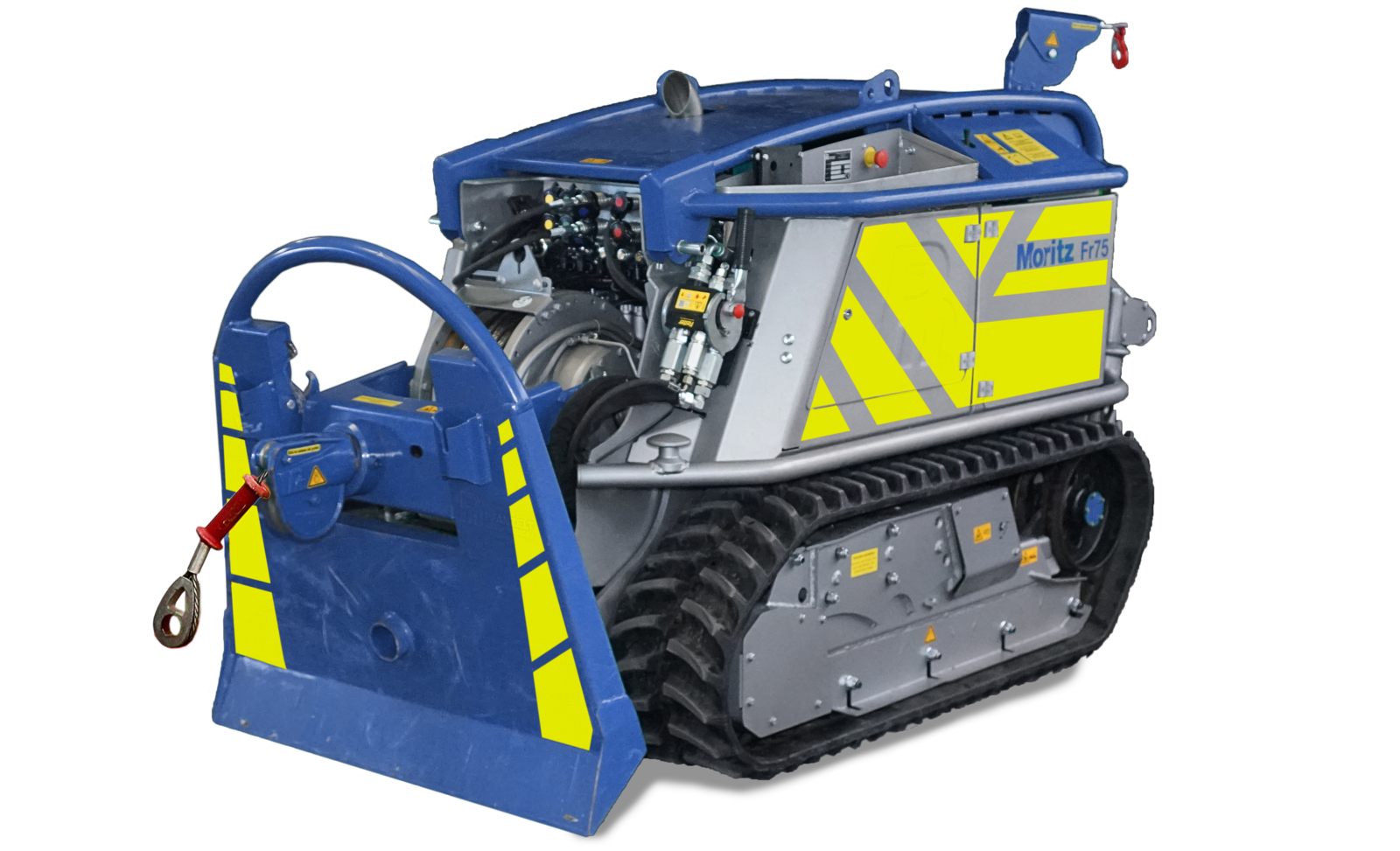 Compagnon idéal en forêt, le Moritz peut être utilisé comme débusqueur ou pour l'abattage dans les zones étroites. Le treuil est intégré dans la machine avec un centre de gravité bas. Le contrôle complet de tous les accessoires est effectué via la radio-commande du Moritz. Des treuils d'une force de traction de 5,6 ou 7,2 t peuvent être installés. Ils peuvent être démonté en peu de temps grâce à un dispositif spécialement conçu à cet effet. Le chenillard Moritz se tient prêt pour effectuer d’autres tâches.