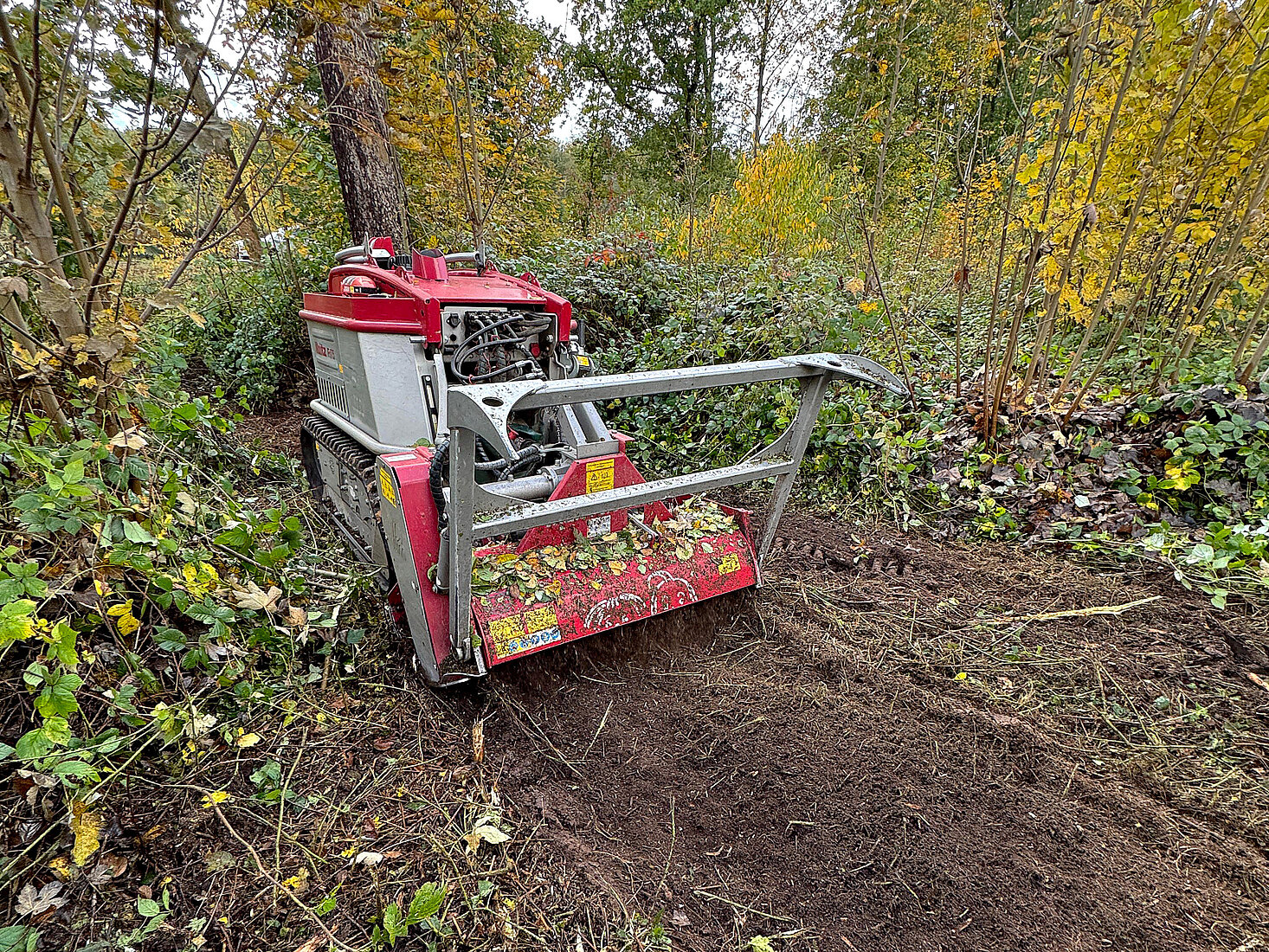 Ainsi, le Moritz ne s’utilise pas seulement pour le domaine forestier, mais peut également être utilisé comme chenillard de fauchage et de tonte. En combinaison avec le broyeur forestier Max de chez Schlang & Reichart il devient le compagnon idéal dans l’entretien des plaines. Tous ces accessoires sont également commandés par la radio-commande du Moritz.