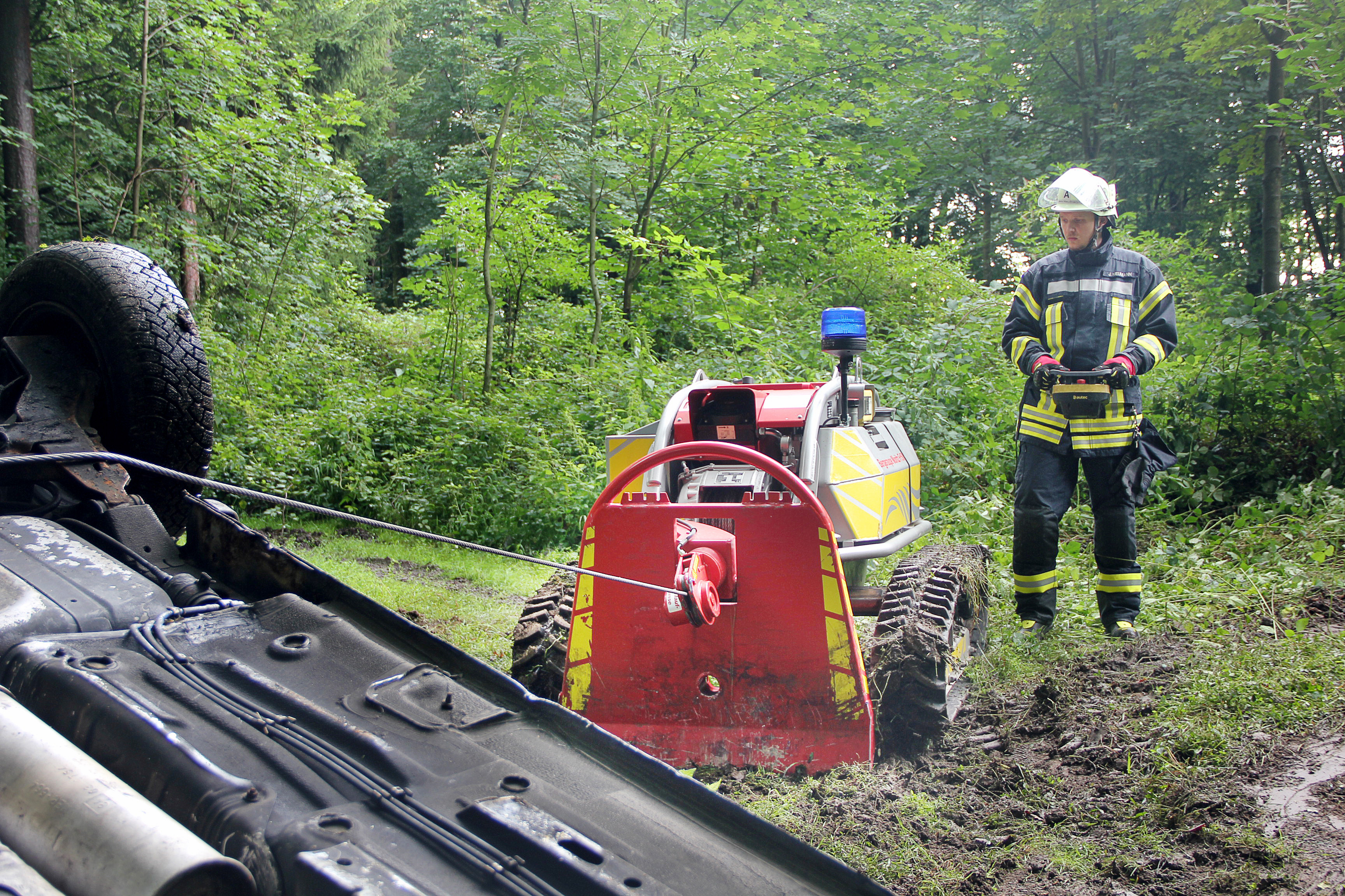 Zugkräftig und höchst präzise präsentiert sich die eingebaute Seilwinde mit 5 t Zugkraft und 120 m Seilkapazität. Die Bedienung der Seilwinde sowie des kompletten Fahrzeuges erfolgt über eine Funksteuerung.