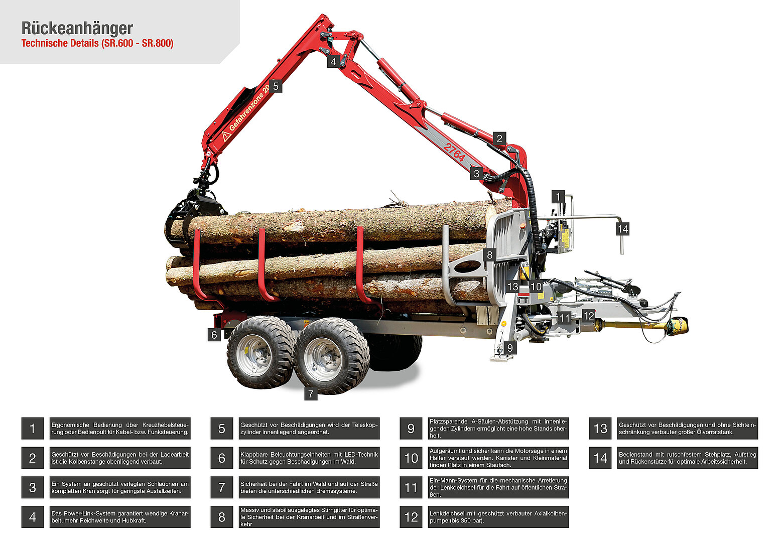 Der Rückeanhänger SR.600 und SR.800 ist serienmäßig mit einer hydraulischen 2-Rad-Bremse ausgestattet. Im Zubehörproramm stehen weitere Varianten zur Verfügung.