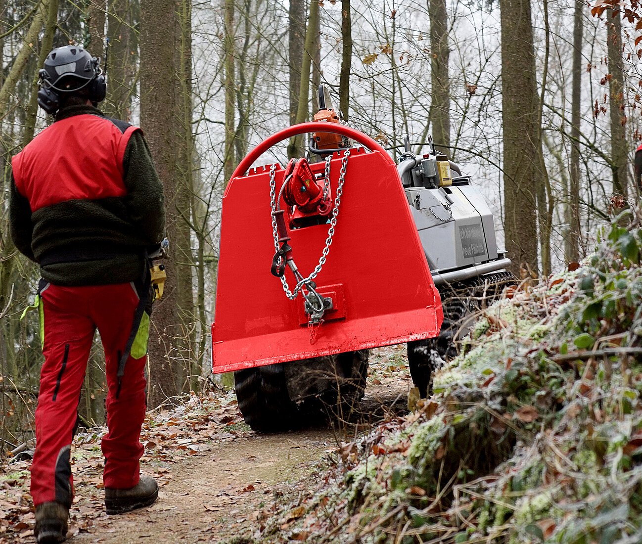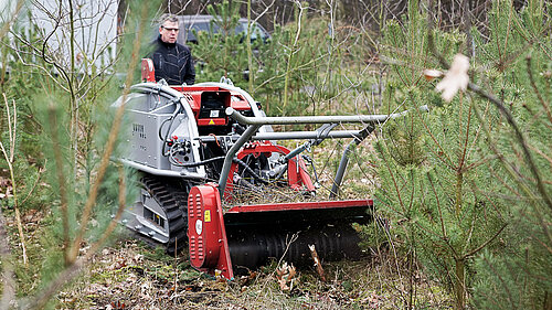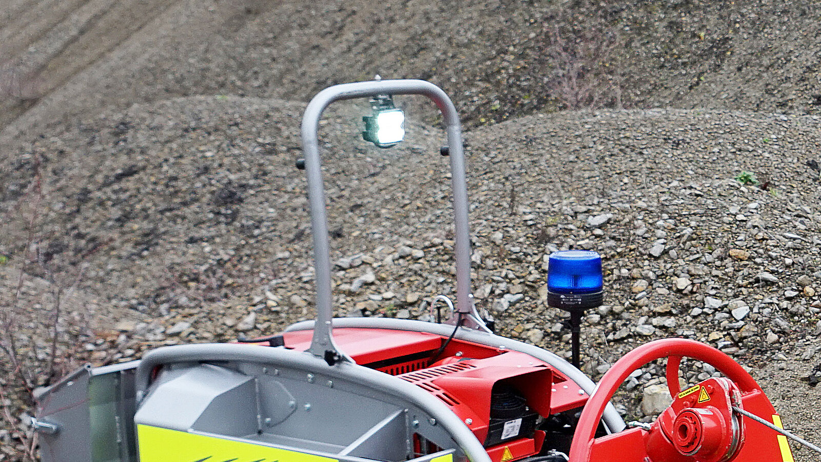 Zugkräftig und höchst präzise präsentiert sich die eingebaute Seilwinde mit 5 t Zugkraft und 120 m Seilkapazität. Die Bedienung der Seilwinde sowie des kompletten Fahrzeuges erfolgt über eine Funksteuerung.